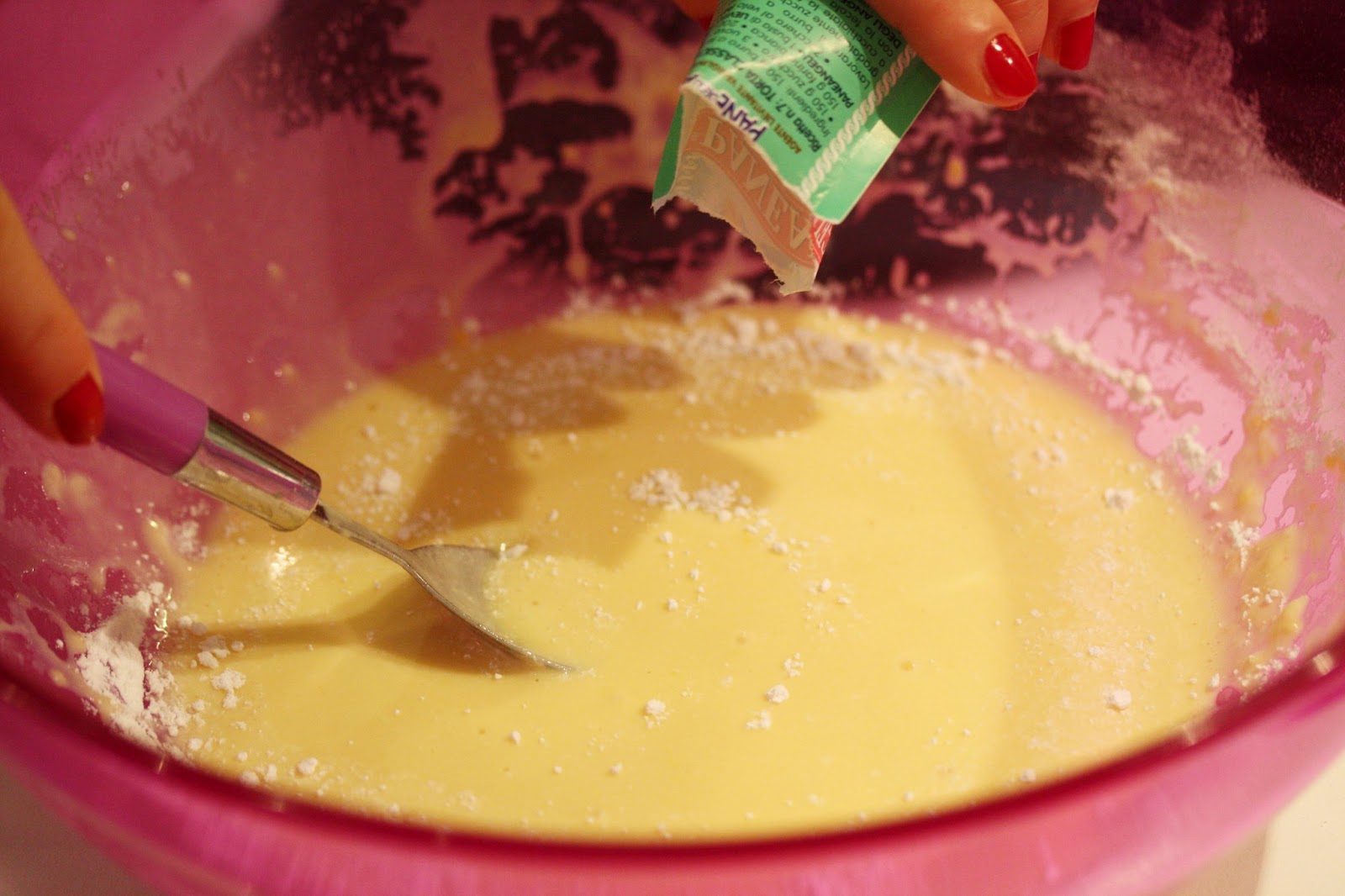 Mescolare il tutto con un frustino o, semplicemente, con un cucchiaio, fino a togliere eventuali grumi di farina e rendere l'impasto denso. Aggiungere poi il lievito e continuare a mescolare.